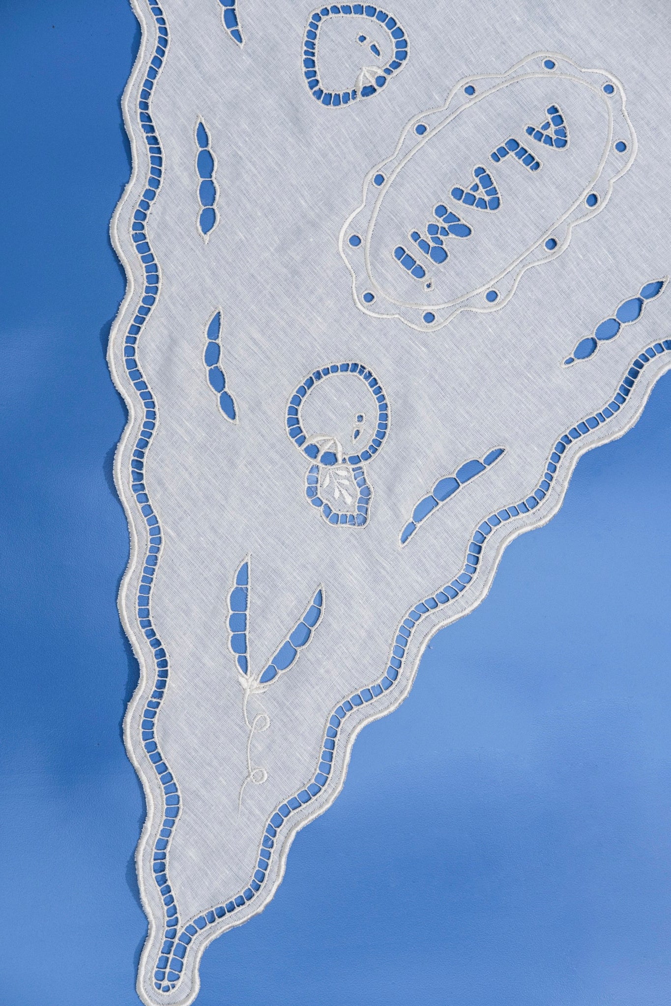 Made from 100% linen in of-white tone, with traditional Indonesian hand-machine embroidery and openwork details using 100% rayon threads.