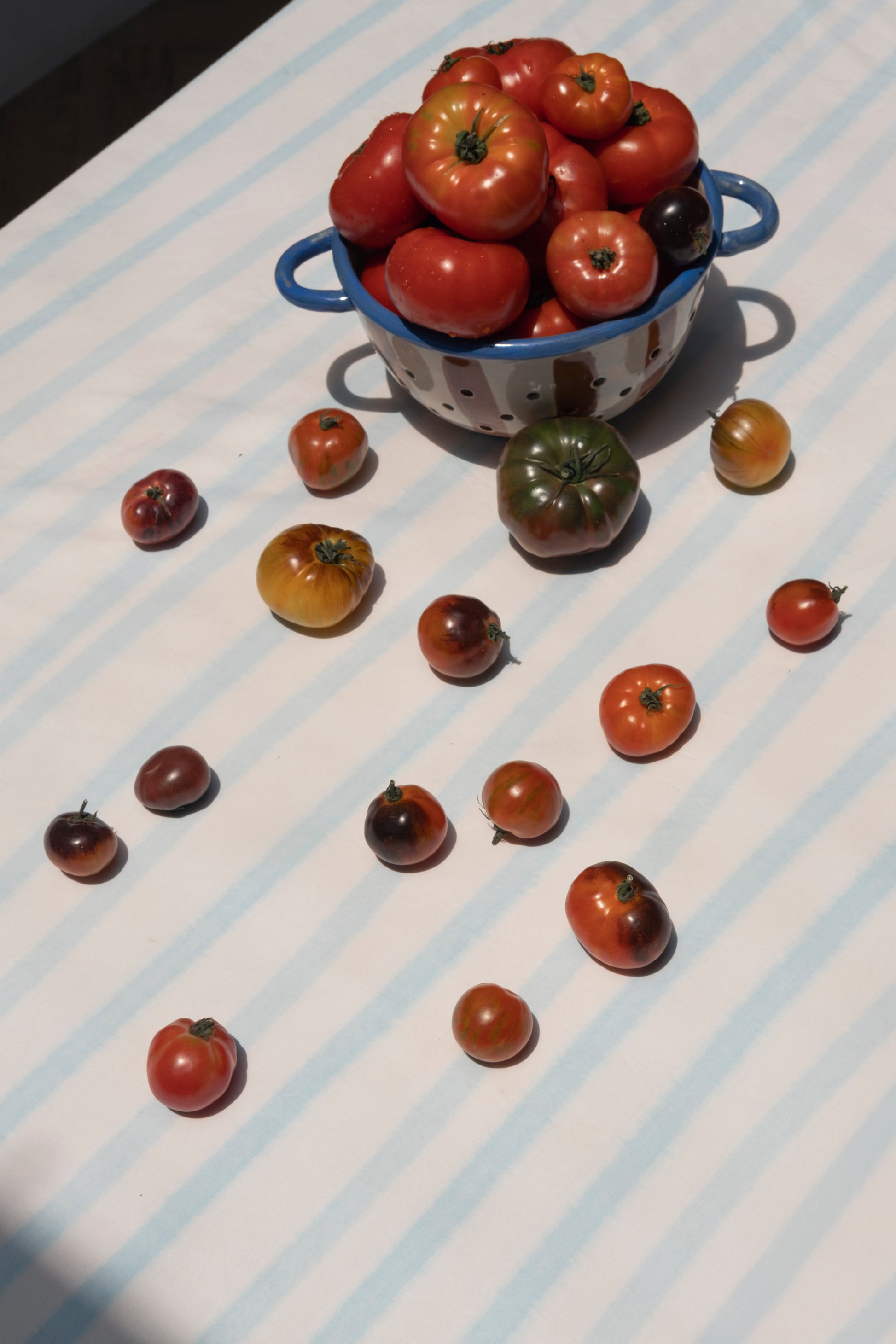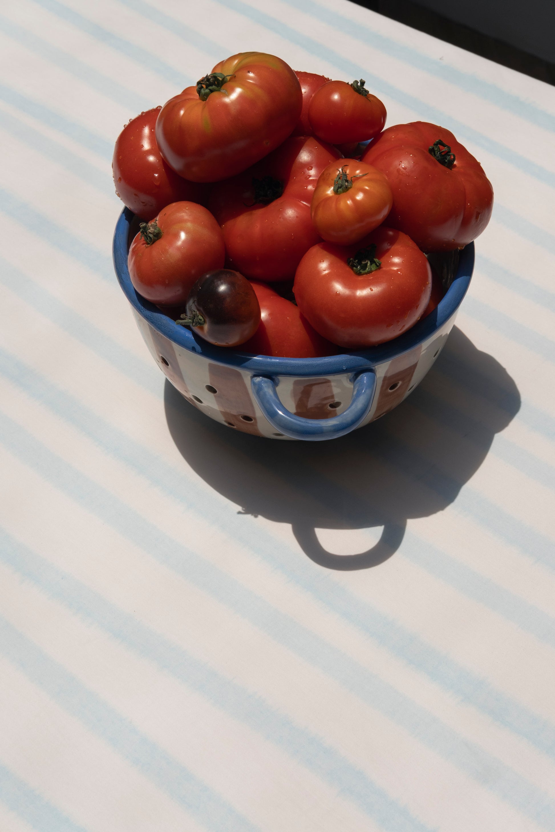 Soft off-white cotton tablecloth hand-painted with gentle sky-blue stripes.